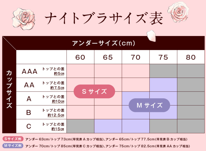 | サイズ | 〇 | S・Mの2サイズ展開のナイトブラ。 AAA~Cカップまで対応! 6色から好きなカラーを選べる! |