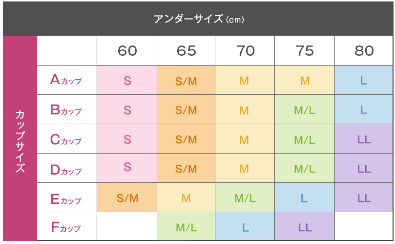 | サイズ | ◎ | S~LLまでの6サイズがあるから A~FカップまでOK! 8色から選べるのも嬉しい! |